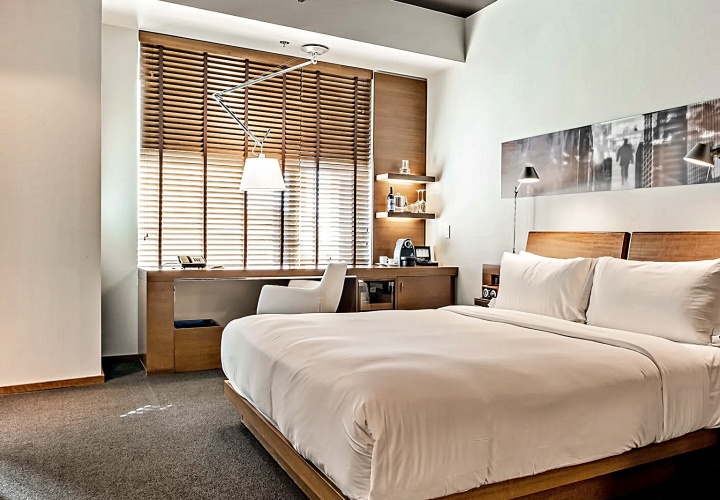 객실 인테리어는 천연 목재의 따뜻함과 미니멀한 배치가 돋보이는 컨템포러리 스타일로 꾸며져 있으며, 층고가 높고 탁 트인 통유리창을 통해 캘거리의 마천루를 감상할 수 있습니다.